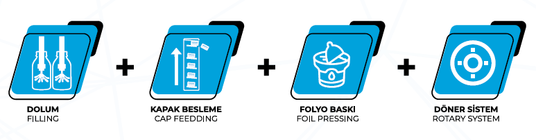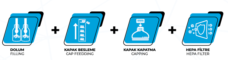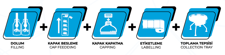 Geniş ürün yelpazemiz; şişe besleme ve toplama tablaları, şişe içi yıkama makineleri, volümetrik, flowmetreli ve loadcell kontrollü dolum sistemleri, kapak kapatma sistemleri, etiketleme makineleri ve hat sonu ambalaj çözümlerini kapsamaktadır. Bu çeşitlilik sayesinde müşterilerimize yalnızca tek makineler değil, aynı zamanda anahtar teslim üretim hatları sunabiliyoruz.
